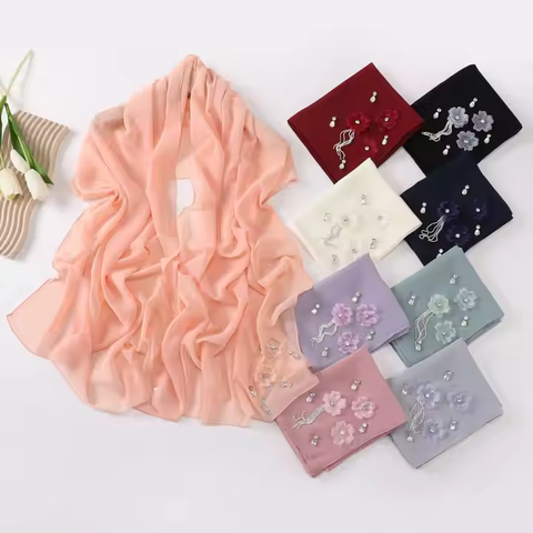 Модная шаль из жемчуга и бриллиантов в новом стиле, простая шифоновая шаль с бриллиантами в форме цветка и мусульманский головной платок